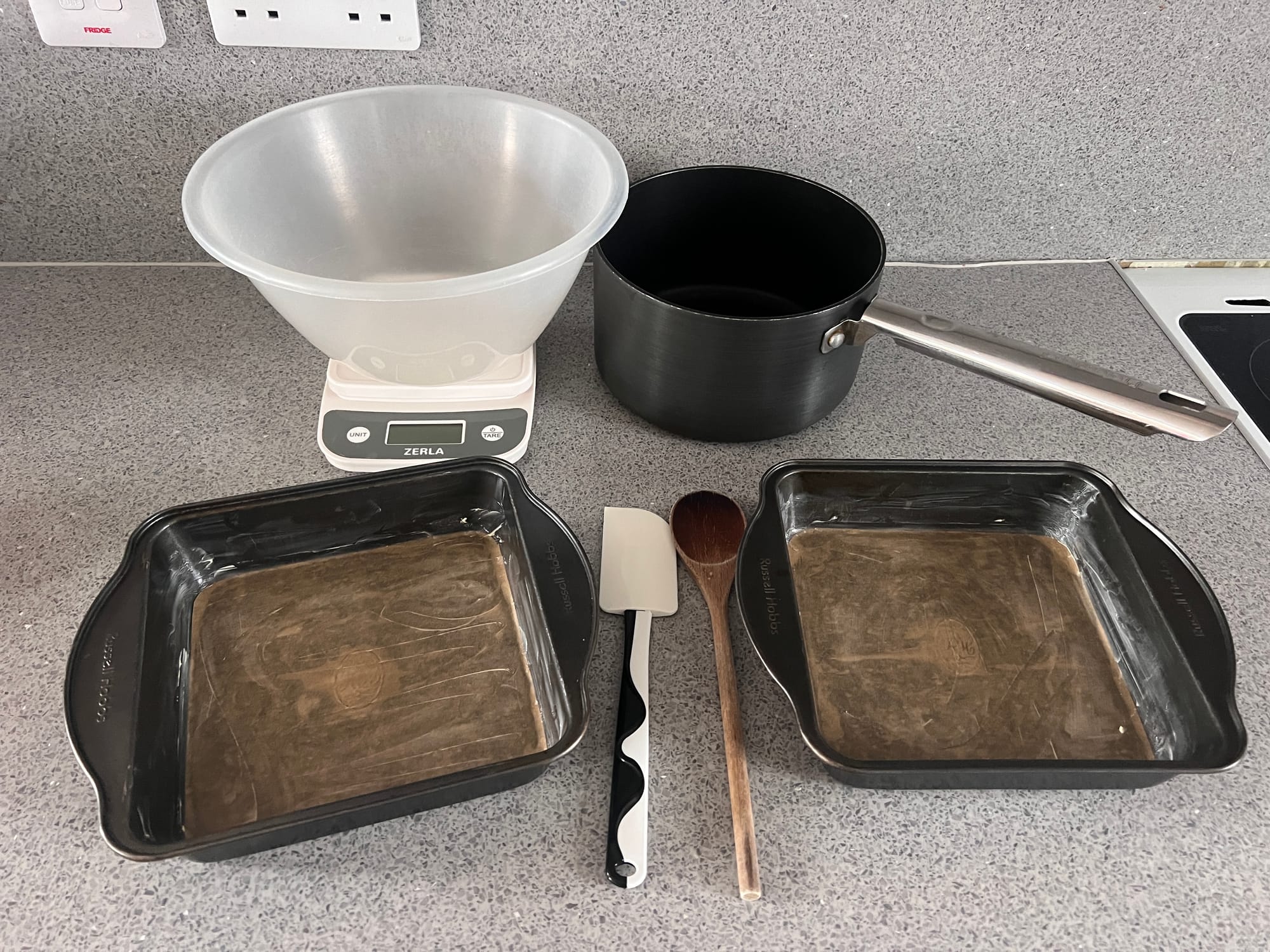 - Preheat oven to 180℃/160℃ fan and grease a 20cm square baking tin. We also line the bottom of the tin with some greaseproof paper.