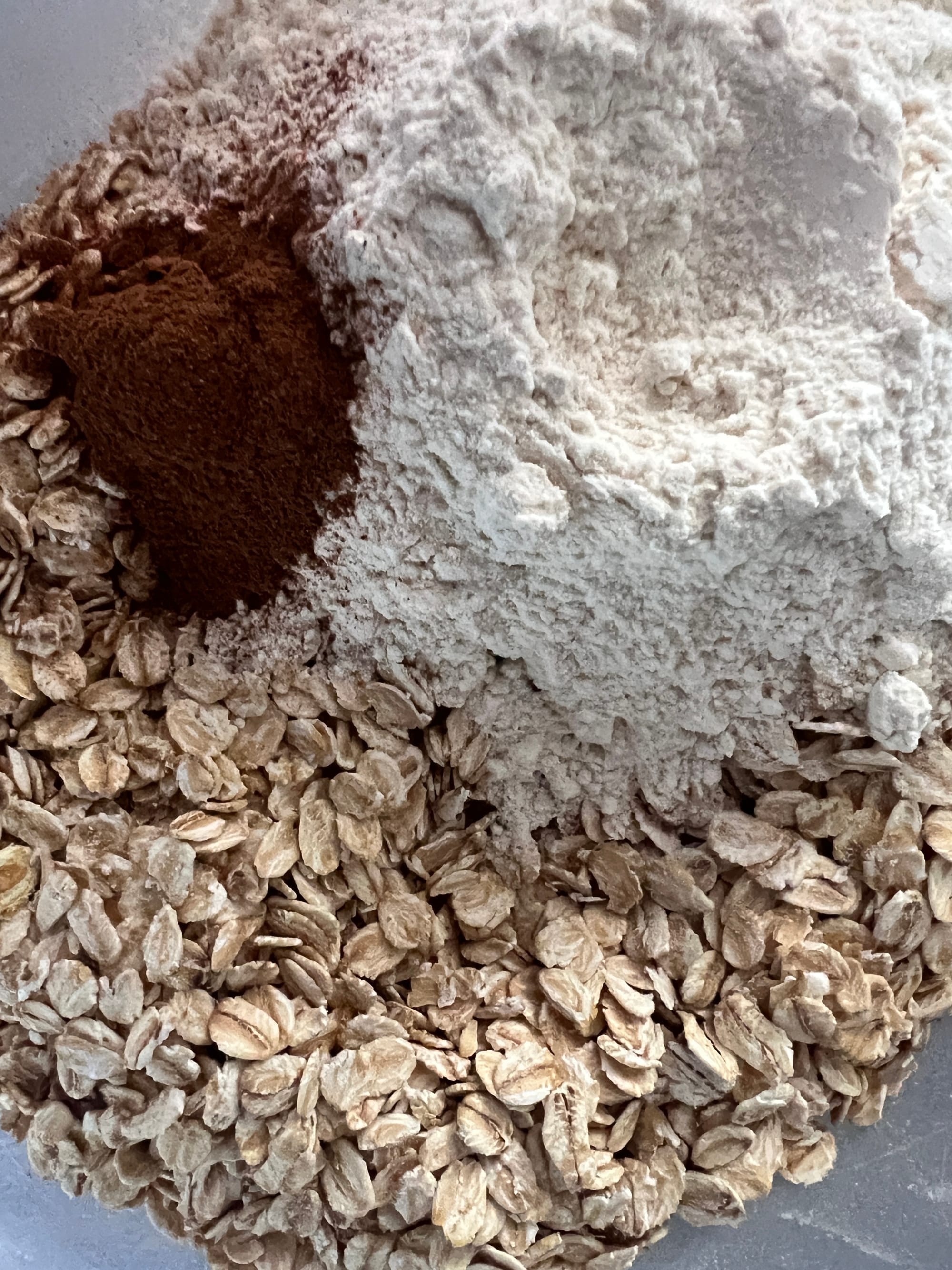 - Combine the oats, flour and cinnamon in a bowl and set aside for later.
