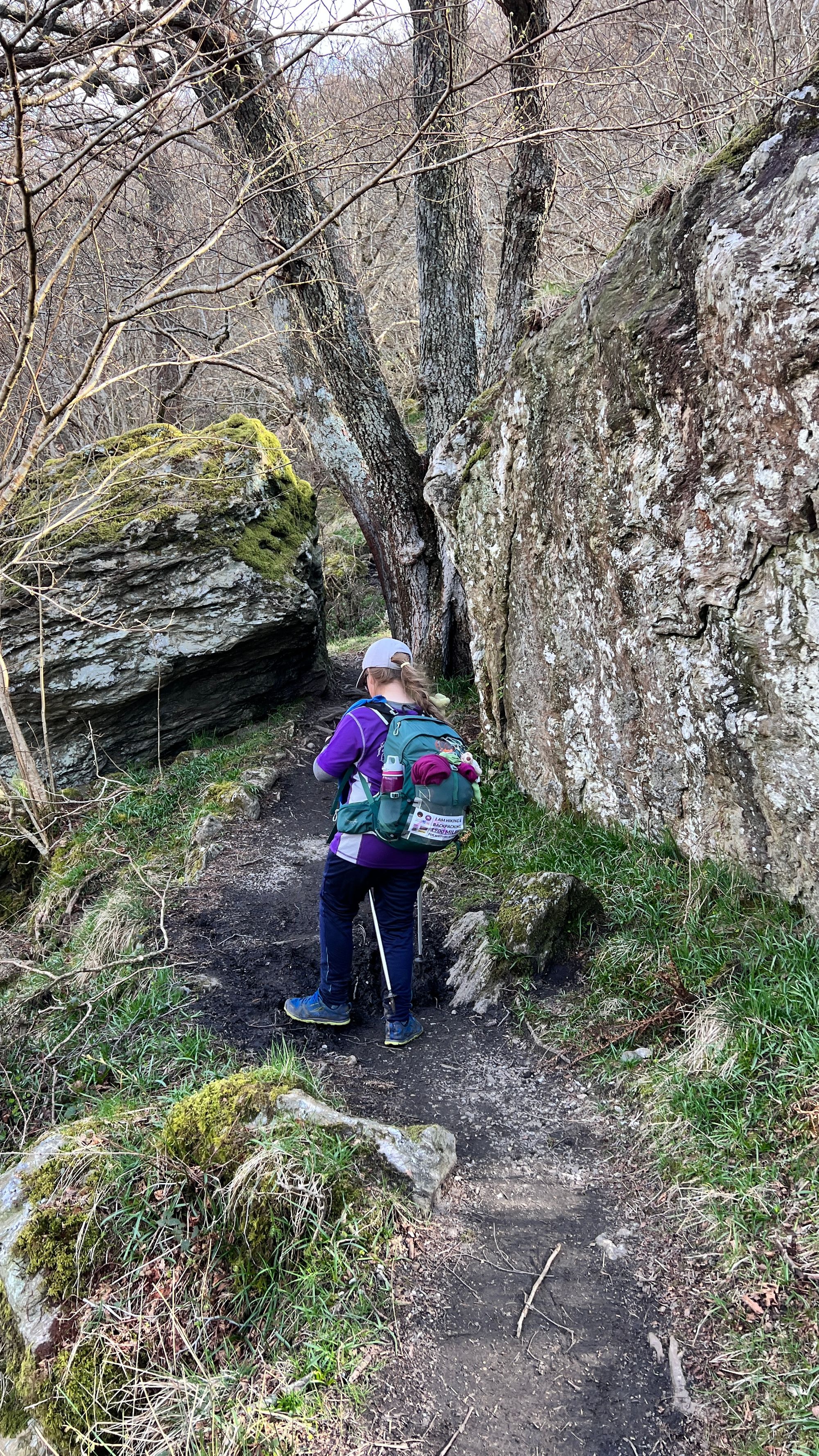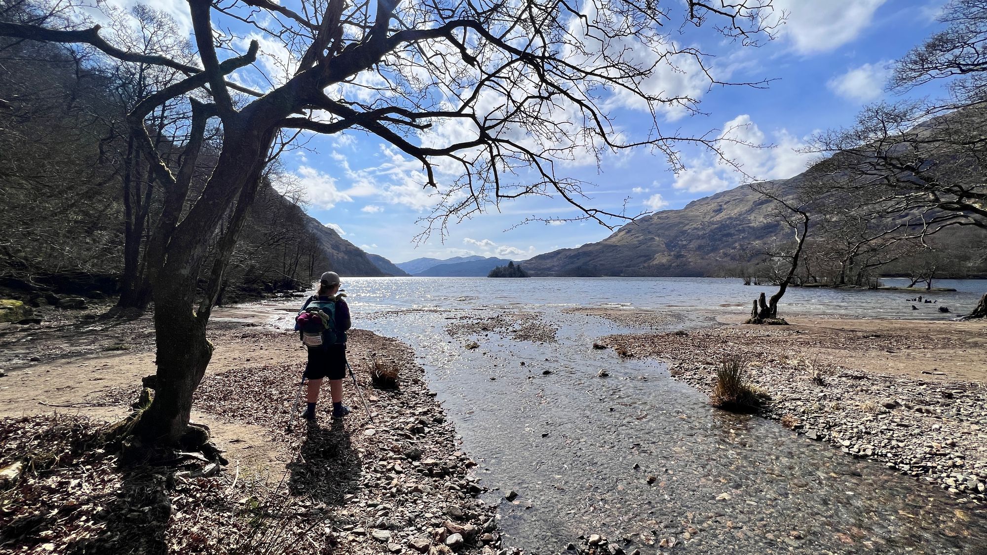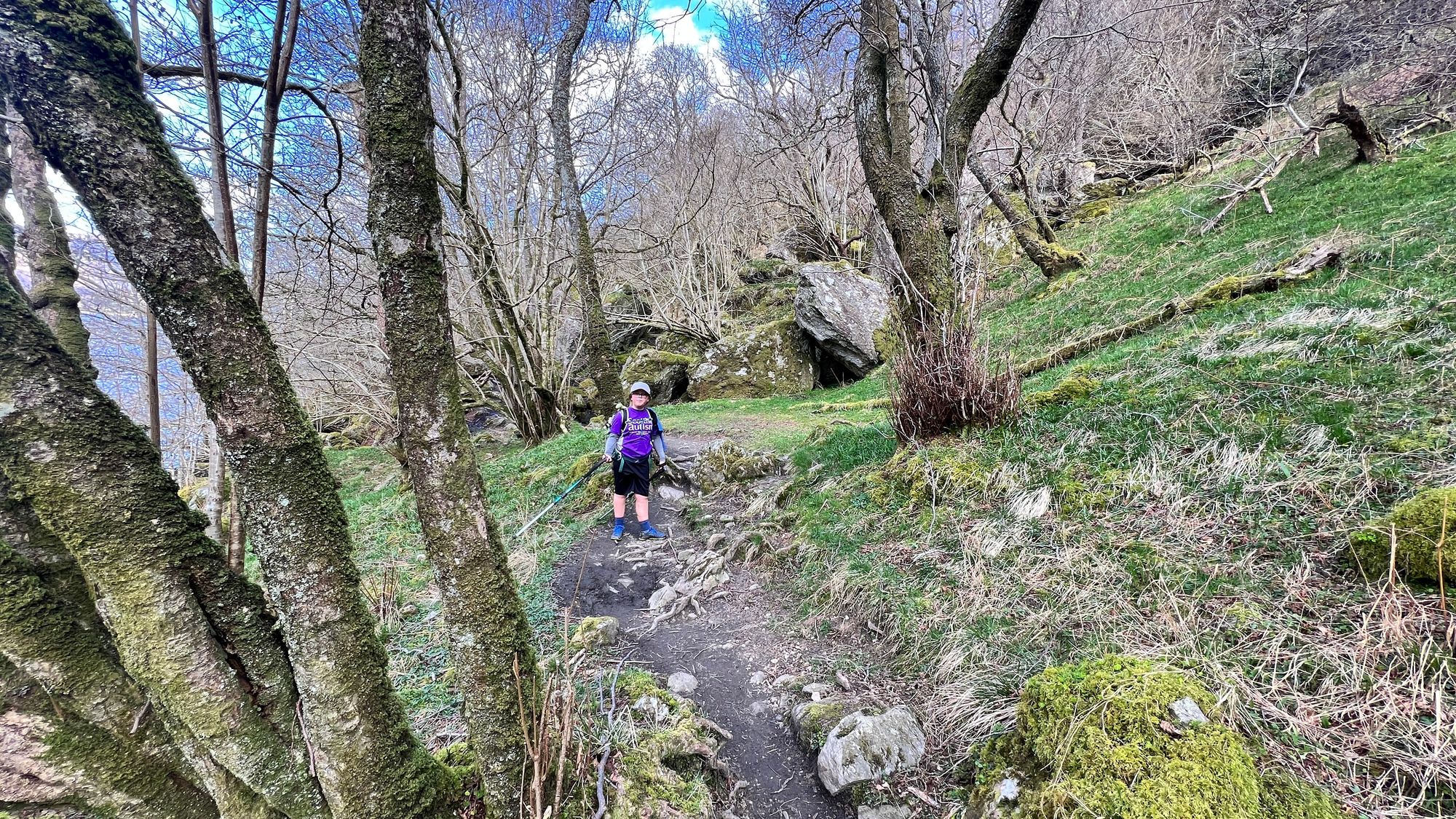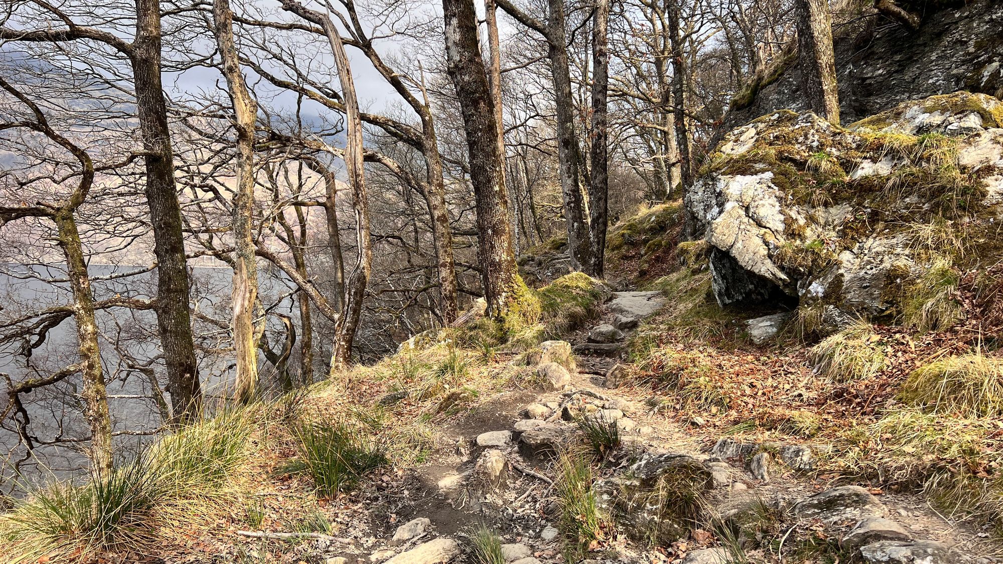 There were sections when Eve had to go on her bottom to slide down This section should not be underestimated especially in wet or icy conditions as it can be lethal. The trail can be 10s of feet above the shore that is littered with boulders, a fall here could be catastrophic, hence why we took it so slow and carefully. We were also incredibly lucky to be blessed with near perfect weather for Loch Lomond.